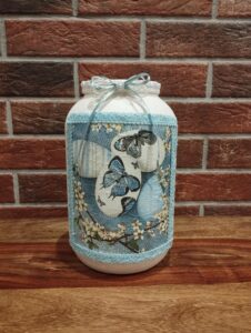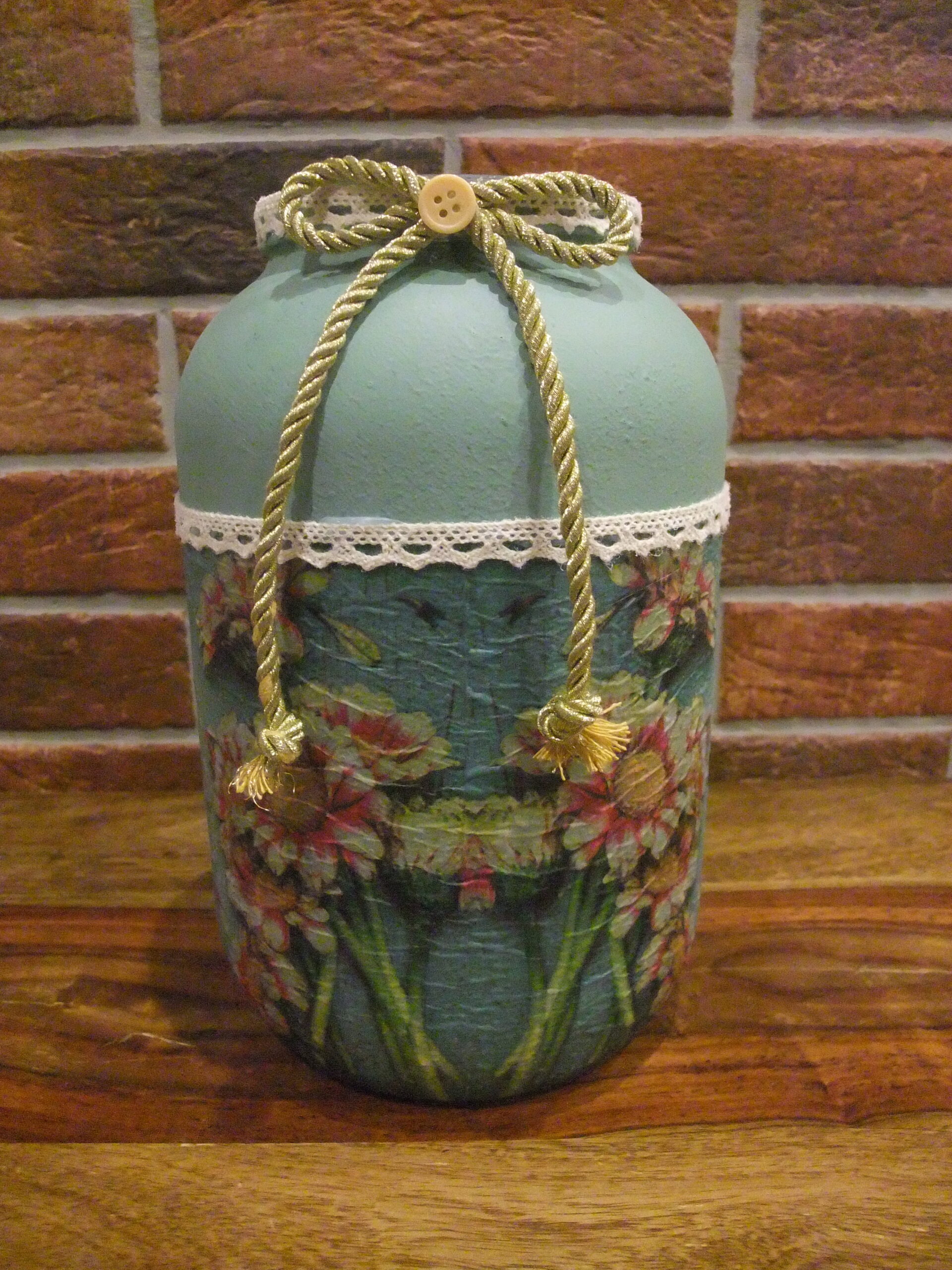 převážně skleněné vázičky a svícny vyrobené technikou decoupage,
